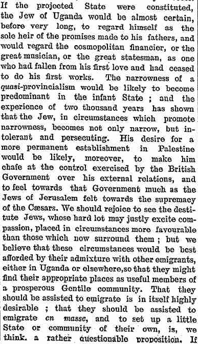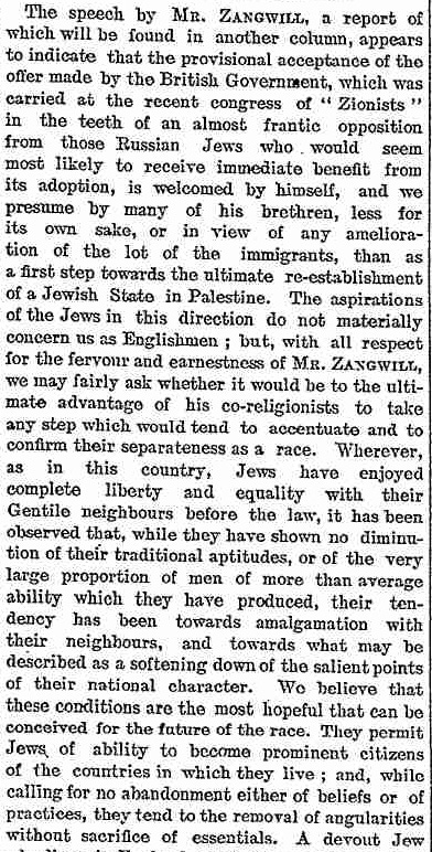 Ansbacher believes that the key to Israel’s international diplomatic and PR predicament is to share this biblical vision with the world. The British once believed in Zionism because they were ‘men of the Bible’ and by abandoning cringe hasbara and embracing our destiny, we can once again get the righteous gentiles to get behind Israeli nationalism. (He cites the late leader of Lubavitch in support of this view). It’s impossible, I think, to overstate just how detached from reality this is. Christian Zionism was the product of a specific and temporary phase in the secularisation of the West. It has always been greeted with, at best, bemusement by Catholics, the Orthodox and ‘classical Protestants’. Liberal Protestants today, obviously, can’t get on board with it either. Christian Zionism, rather, was one of the many spasms of a tradition in collapse, a mutant combination of traditional and radical ideas cobbled together to appeal to culturally adrift people desperate for some kind of religion to hang on to. It survives today as not just cringe, but radioactive cringe, its expiration date measured in funerals. In any case, the core of western support for Israel was never Christian Zionism anyway, but generic liberalism before it radicalised on race, which Zionists exploited with stuff like this: