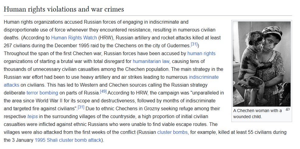 Before we sign off for the week, there’s one more thing I discovered during the Wikipedia binge that constituted my research for this article. As mentioned above, 25,000 civilians died in the Second Chechen War. That’s pretty bad, though not half as bad as Gaza (though it is worse if we go down the proportion-of-population route). More to the point, though, it wasn’t anywhere near as bad as the First Chechen War: