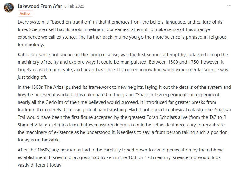 It’s easy to overcomplicate things, so let’s repeat again: fundamentally, the difference between Sabbateans and non-Sabbateans was about whether the messiah had come. The non-Sabbateans had a problem, namely how Zoharism could promise the messiah and a messiah came, but he was a dud. They responded by trying to take an evolving tradition and freeze it right before the point at which it evolved into Sabbateanism, elevating Lurianic kabbalah into the final statement of Zoharism beyond which no progress was possible.3 The Sabbateans had a different problem: if the messiah had come, how come nothing had happened?