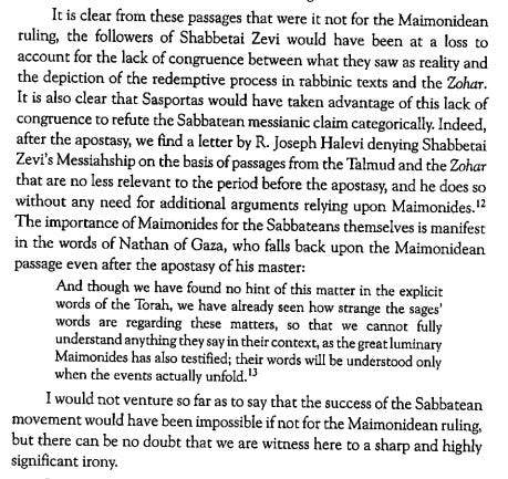 The first reason for this, which remarkably enough has barely been commented on, is that Shabtai Tzvi’s conversion to Islam was not in fact antinomian. Five-hundred years prior, the Almohads, a renegade Berber dynasty whose rebellion against the corruptions and compromises of the Abbasids had led them to jettison much of normative Sunnism in pursuit of purifying it, abolished dhimmi protections for people of the book and demanded Jews and Christians convert on pain of death. Whether the Jews of the Maghreb and Andalus who had fallen under their rule could save their lives by saying the shahada, or were rather required to accept execution was extensively discussed by the decisors of the time. The accepted view was that of Maimonides, namely that Islam is not Avodah Zarah, and that, as such, it was permitted (indeed, obligatory) to perform conversion for the purpose of saving a Jewish life. Thus, Shabtai Tzvi, in fact, did the correct thing according to Jewish law, all the more so since, had he refused, many other Jews would certainly have been killed by the Ottomans in punishment for his farcical quasi-rebellion.