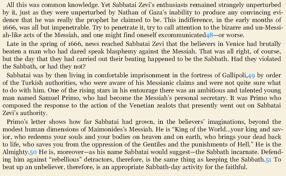 Anti-Sabbateanism was, therefore, not so much a set of ideas as a mixture of evasion and irritable mental gestures. Like post-war American conservatism, it sought to re-arrange a cluster of concepts that clearly and ineluctably led precisely to the results that it was organised to oppose. In as much as it worked, it was because ideas aren’t everything. Jews wanted their religion to not be destroyed, so they said whatever they needed to say. It was not for a full century that anyone attempted to attack Sabbatean doctrines in a fundamental and principled way. We will get to that in due course, but in the meantime the Sabbateans, without doubt the majority of intellectually productive Jewry, had a more interesting task.