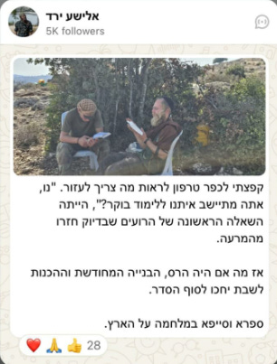 Elisha Yered is a Breslev terrorist from the Binyamin region implicated in at least one killing. He is pretty active and has benefitted from Katz’ decision last November to decriminalise Jewish violence in the Occupied Territories and so is feeling pretty cock-a-hoop these days. For the goyim and noobs who don’t read Hebrew, he is recounting how he went to visit the shepherds of Kfar Tarfon, another Binyamin outpost, to lend a hand, and was touched to find that they would not discuss mundane matters until they had finished their morning learning. 🤗.